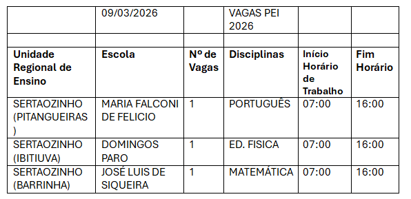 A Unidade Regional de Ensino de Sertãozinho, INFORMA as vagas para o Programa de Ensino Integral – PEI ano letivo 2026 no processo de atribuição durante o ano.
