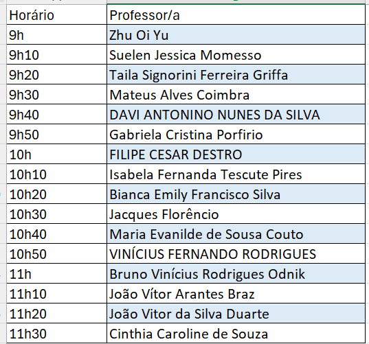 Cronograma: Conforme agendamento individual e divulgado abaixo.